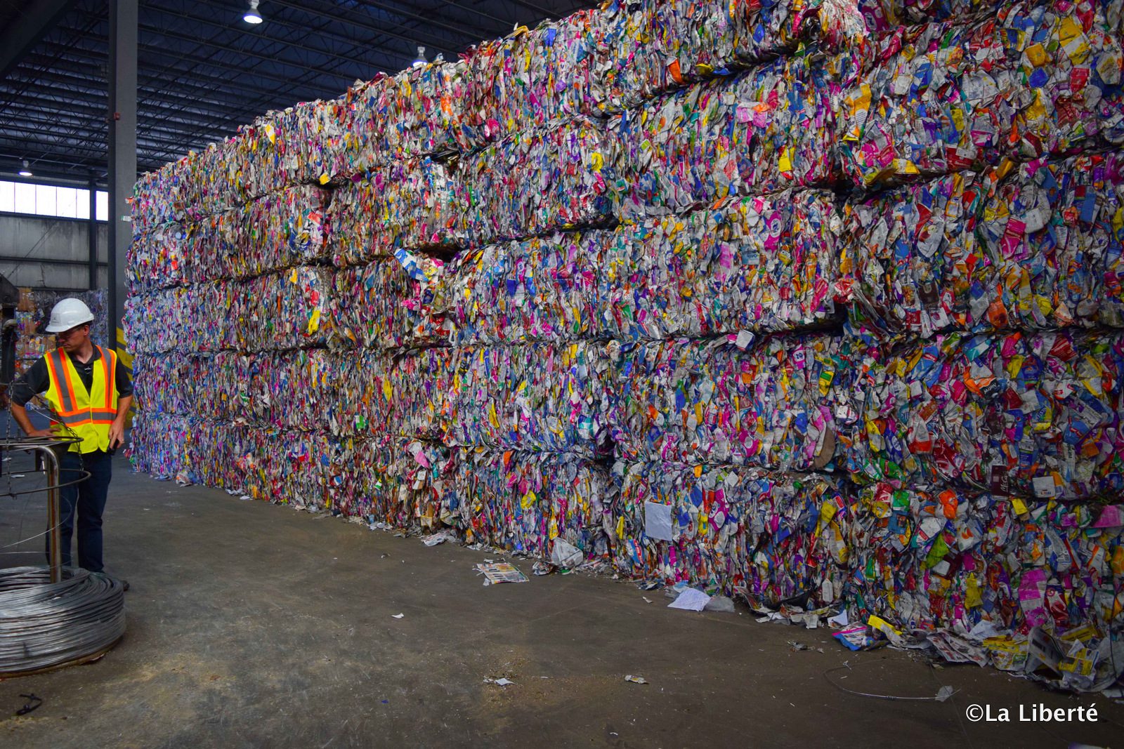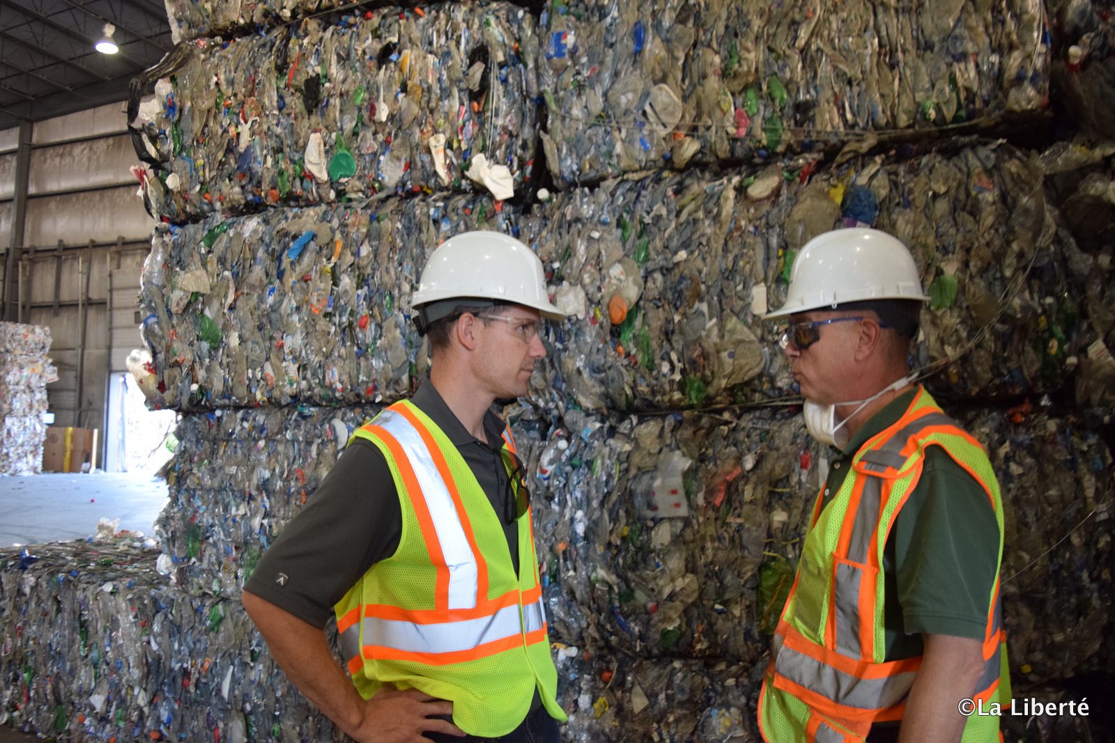 Mark Kinsley, superviseur de la gestion des déchets à la Ville de Winnipeg, et Bill Waddell, vice- président des opérations chez Emterra Prairies, devant une montagne de contenants en plastique compressés et prêts à être expédiés.